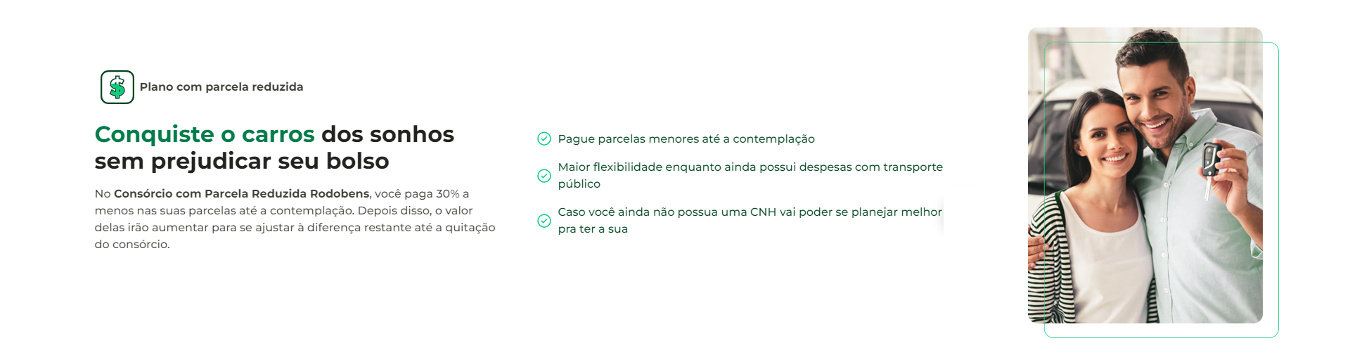 Você escolhe como pagar, tendo a opção com Parcela Reduzida Rodobens, você paga 30% a menos nas suas parcelas até a contemplação. Depois disso, o valor delas irão aumentar para se ajustar à diferença restante até a quitação do consórcio.